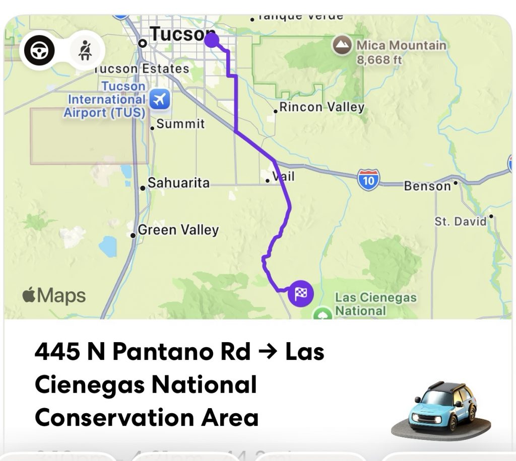 We were unable to try out the RTT until this past weekend, Friday, February 6th 2026. It was not hard to determine where to go. In March we leave Tucson and work our way over 2 weeks to Bisbee, AZ (YAY!!) On the way there we have scheduled a stop at the Las Cienegas National Conservation Area (NCA) that is essentially BLM land. BLM (Bureau of Land Management) land is free to stay on for up to 2 weeks. and there are some very large sites here so we can get Howl down the dirt road and to the sites. If any are open.